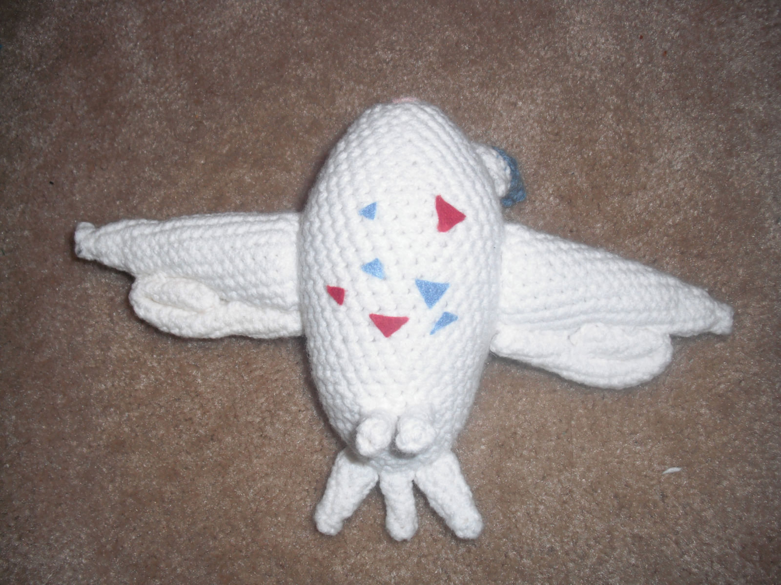 My latest pattern is definitely one of my favorite pokemon. On Soul Silver he’s a part of my party (lvl 61: Aura Sphere, Fly, Extrasensory, and Metronome for those who are interested), so I had to try and make him. With a little coaxing from Beau I got to work on him shortly after finishing charizard and had the body and spikes done pretty quickly. The wings kind of scared me, but Beau and I figured out a way to do them and I think they turned out pretty nicely. I hope you like him!